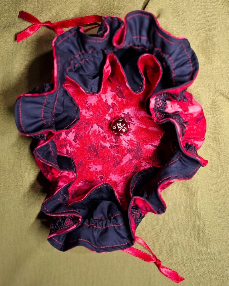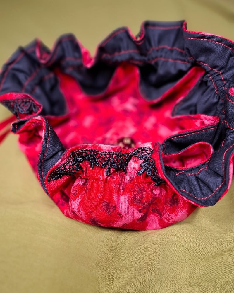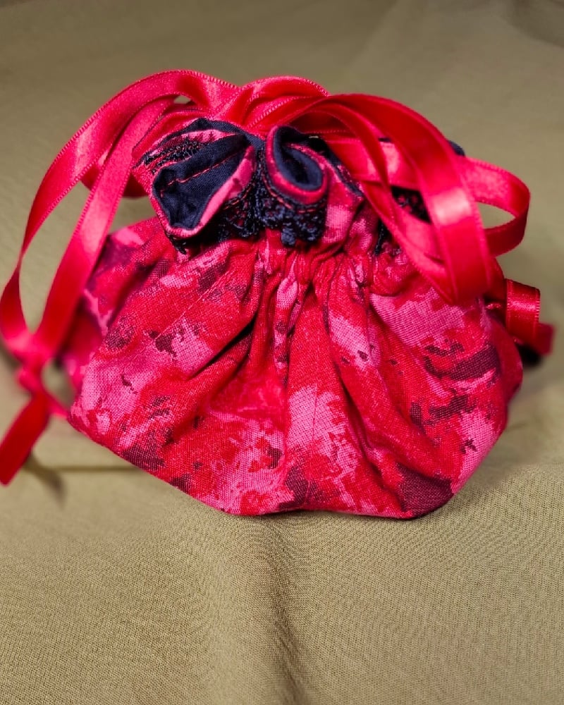 This Avernus design is made with a paintstroke red cotton and added black guipure lace trim. The bag opens & closes with a satin ribbon drawstring.