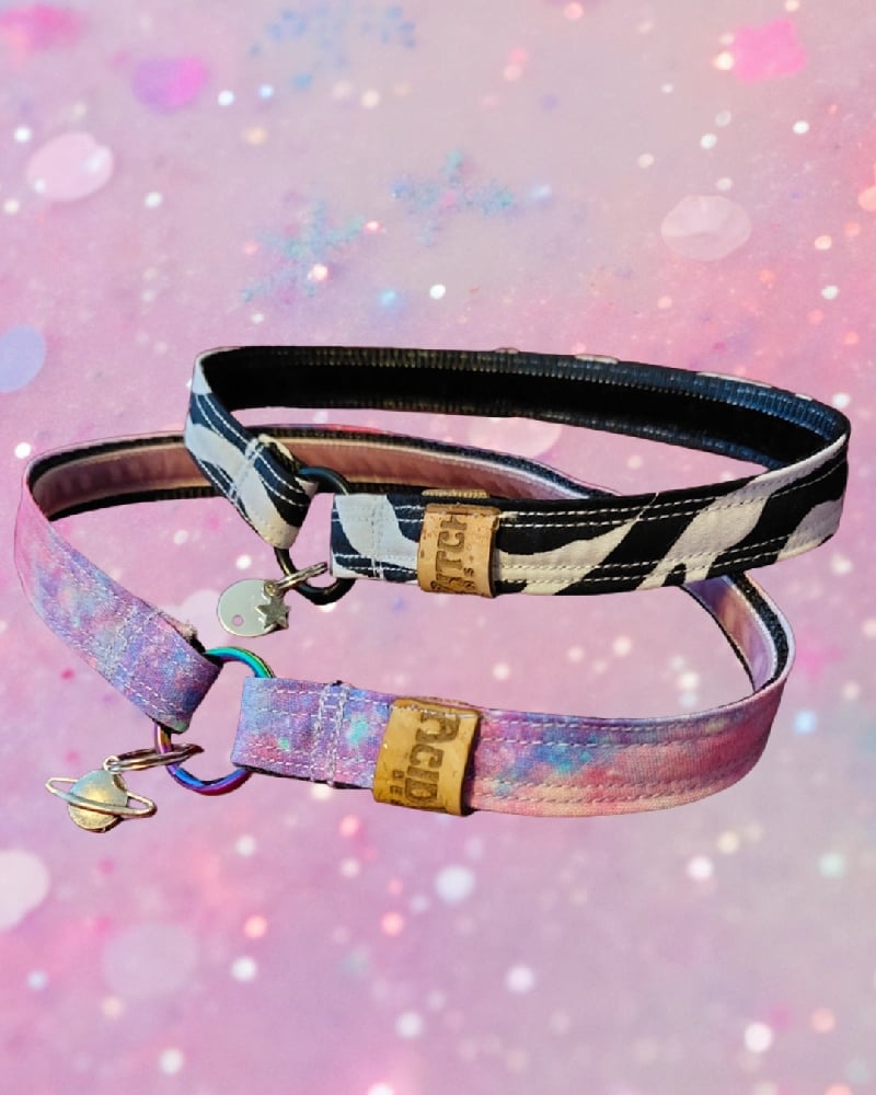 These dog collars are perfect for ID tags or walking little beasties around the realm. These collars do not open so bear that in mind when choosing a size that can fit over their head.