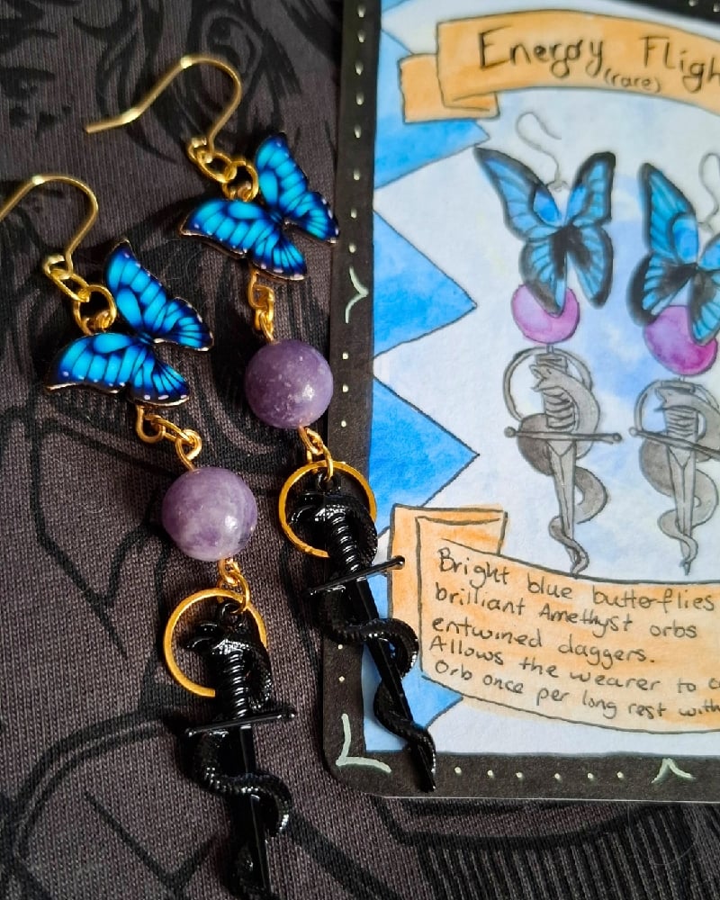 Bright blue butterflies hover above brilliant Amethyst orbs and snake-entwined daggers. Allows the wearer to cast Chromatic Orb once per long rest without using a spell slot.