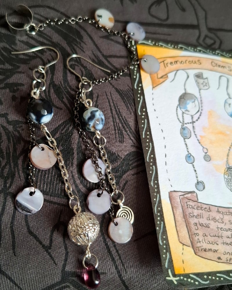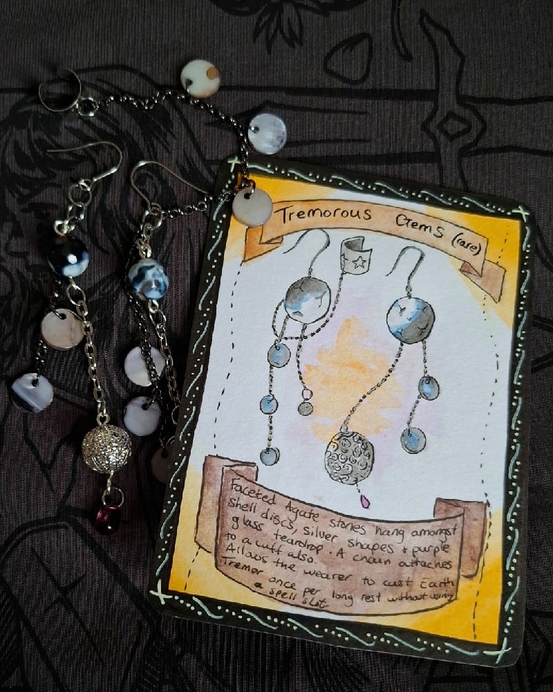Faceted Agate stones hang amongst shell discs, silver shapes & a purple glass teardrop. A chain attaches to a cuff also. Allows the wearer to cast Earth Tremor once per long rest without using a spell slot.