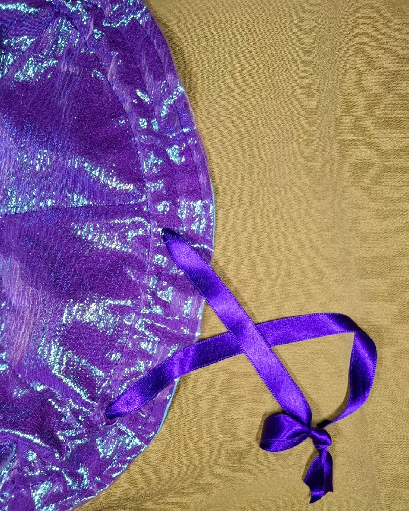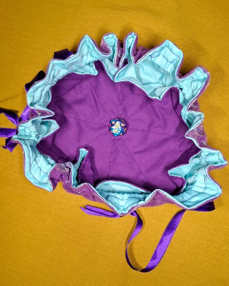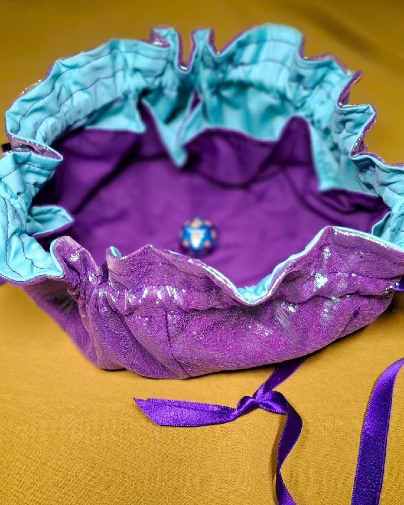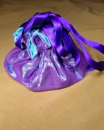 This Thunderjuice design is enrobed in a colourshift organza, with purple and aqua interior. The bag opens & closes with a satin ribbon drawstring.