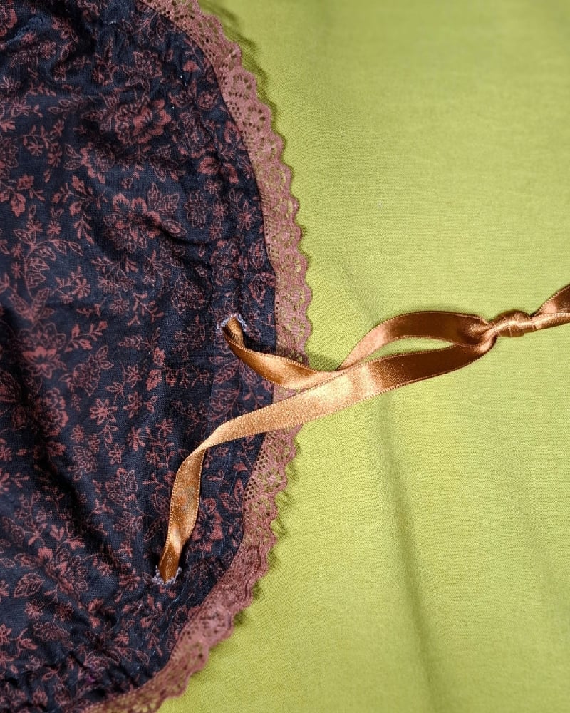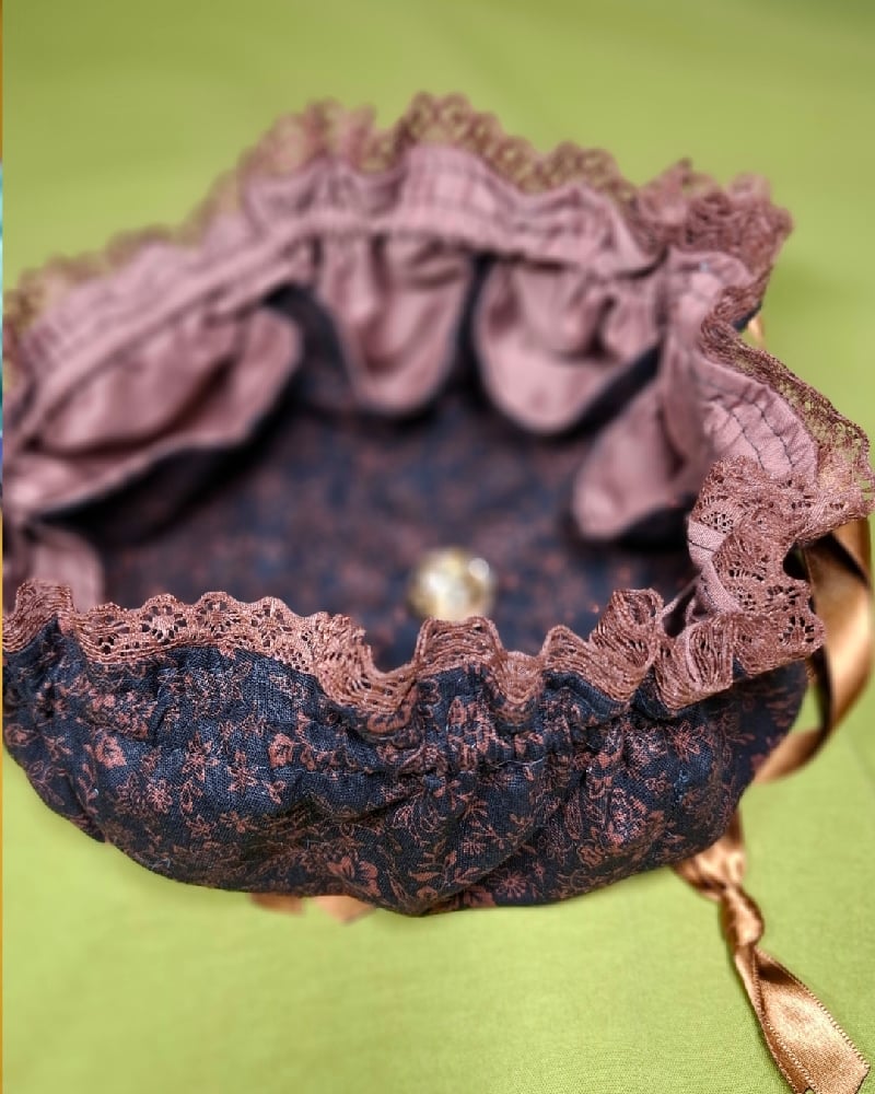 This Underdark design is made with black & brown fabric with added brown lace. The bag opens & closes with a satin ribbon drawstring.